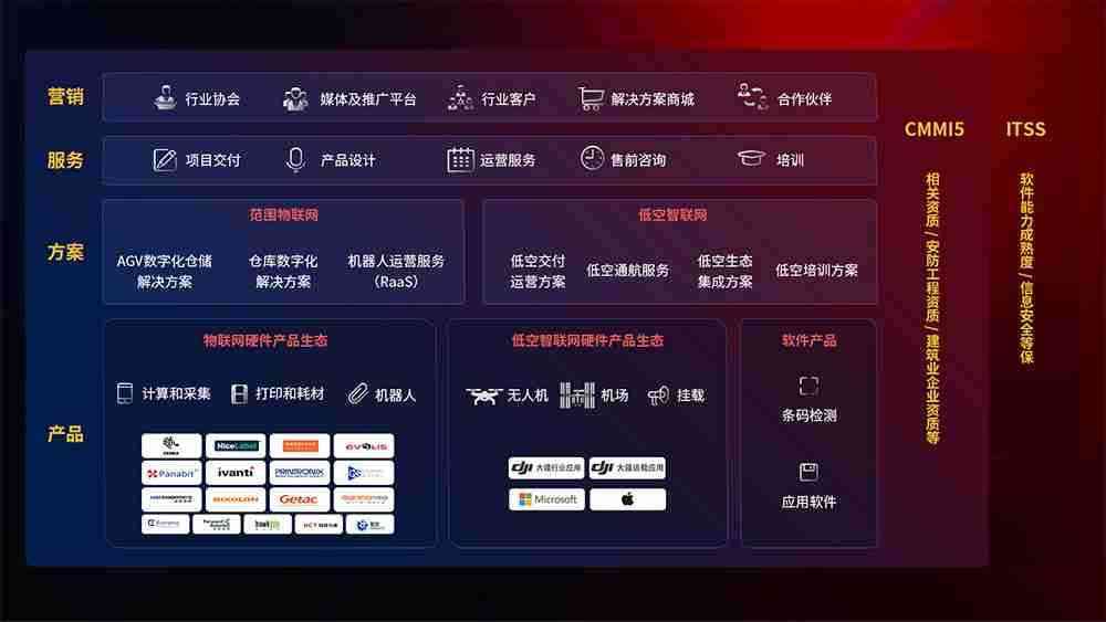 聚合国内外先进的物联网硬件产品品牌,,,聚焦数字化仓储、、机器人运营、、、、低空智联网等领域,,共同打造适合客户业务场景的解决方案并提供交付服务